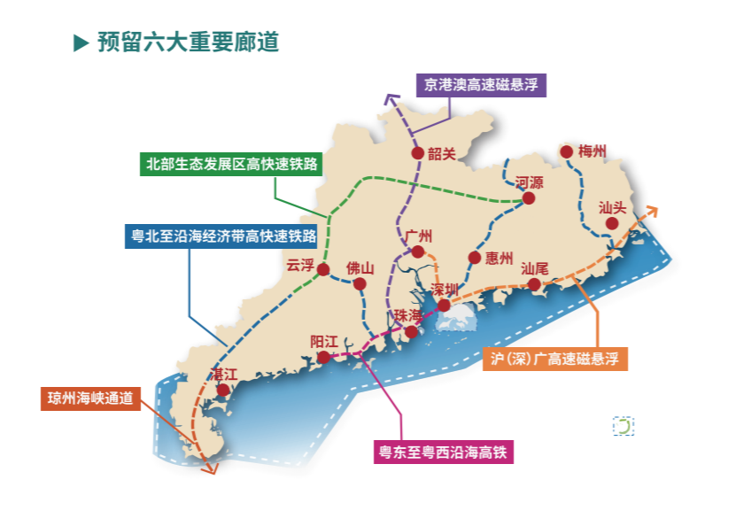 《规划》中提出,到2035年,全省常住人口规模为1.3亿人,城镇化水平约80%,建设广州都市圈、深圳都市圈、珠江口西岸都市圈、汕潮揭都市圈、湛茂都市圈等5个现代化都市圈。同时预留六大重要交通廊道,其中包括京港澳高速磁悬浮、沪(深)广高速磁悬浮。这也是广东首次明确提出两大磁悬浮高速通道的构想。