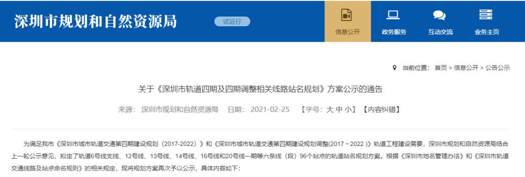 2月25日,深圳市规划和自然资源局发布关于《深圳市轨道四期及四期调整相关线路站名规划》方案公示的通告。