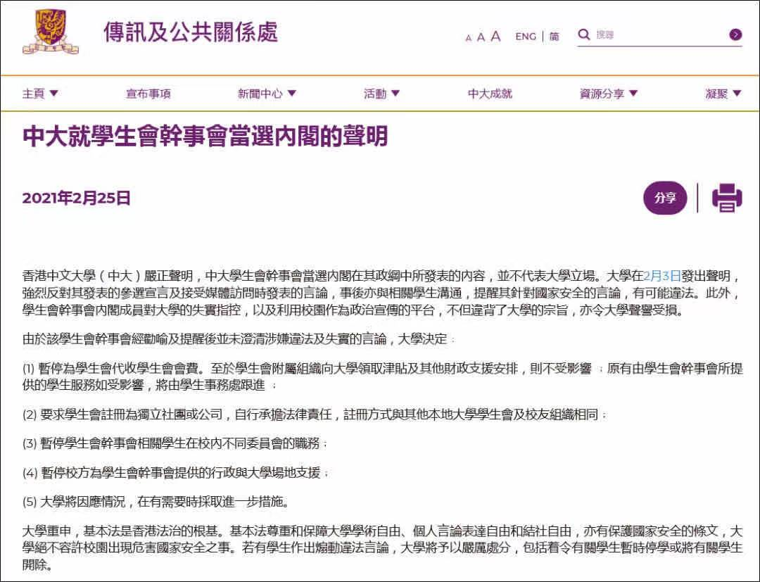 对此,港中大25日发表声明称,学生会的政纲内容并不代表大学立场。校方曾在2月3日发出声明,强烈反对“朔夜”发表的参选宣言及接受媒体访问时发表的言论,事后亦与相关学生沟通,提醒其针对国家安全的言论,有可能违法。此外,学生会干事会“内阁”成员对大学的失实指控,以及利用校园作为政治宣传的平台,不但违背了大学的宗旨,亦令大学声誉受损。