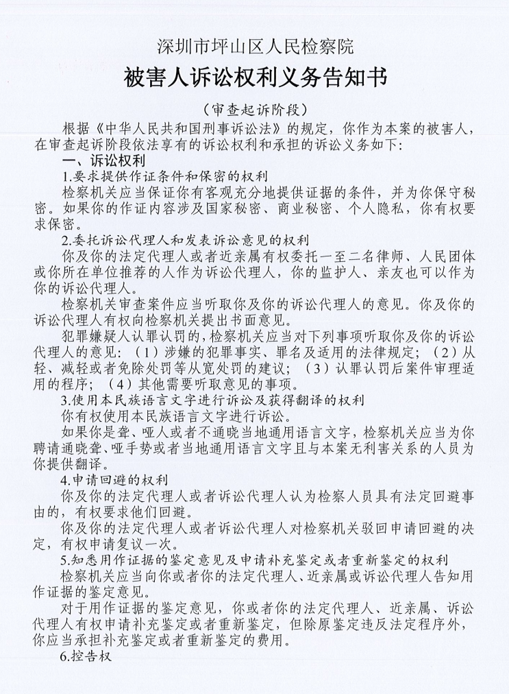 犯罪嫌疑人廖春燕涉嫌集资诈骗案一案,已移送坪山检察院审查起诉。由于本案被害人人数众多,经坪山检察院联系,仍有部分被害人无法通知。现采取公告方式告知本案被害人有权委托诉讼代理人及在审查起诉阶段的诉讼权利,内容详见《深圳市坪山区人民检察院被害人诉讼权利义务告知书》。