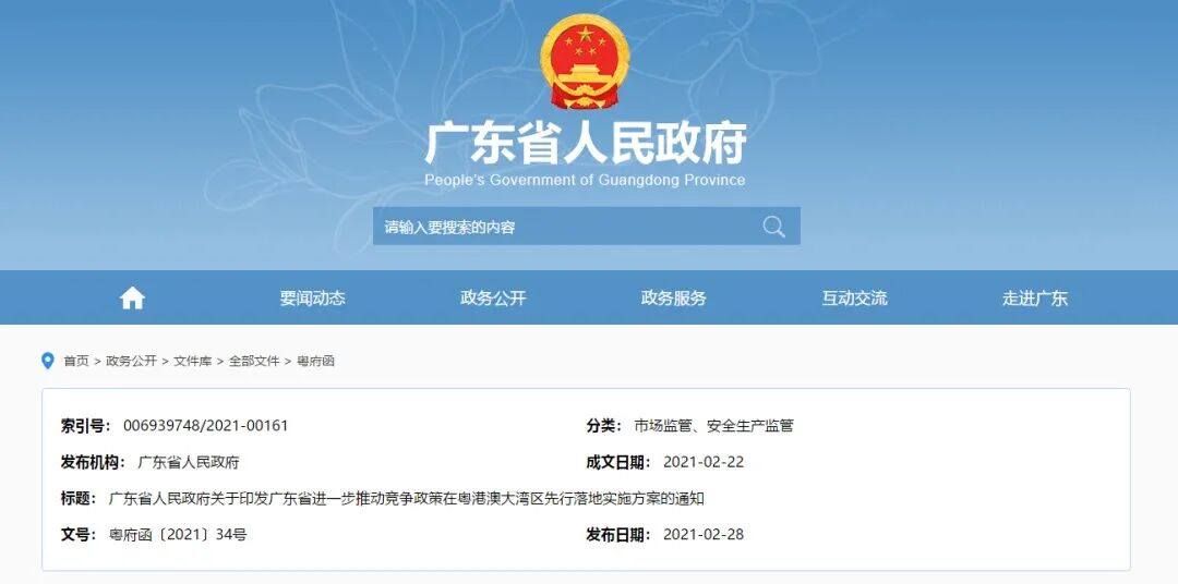 小政获悉,2月28日,广东省人民政府网站发布《广东省进一步推动竞争政策在粤港澳大湾区先行落地的实施方案》,内容包括组建广东省粤港澳大湾区竞争政策委员会、全面落实公平竞争审查制度、加强和改进反垄断执法等,其中,专门提到支持深圳开展竞争执法先行试点。