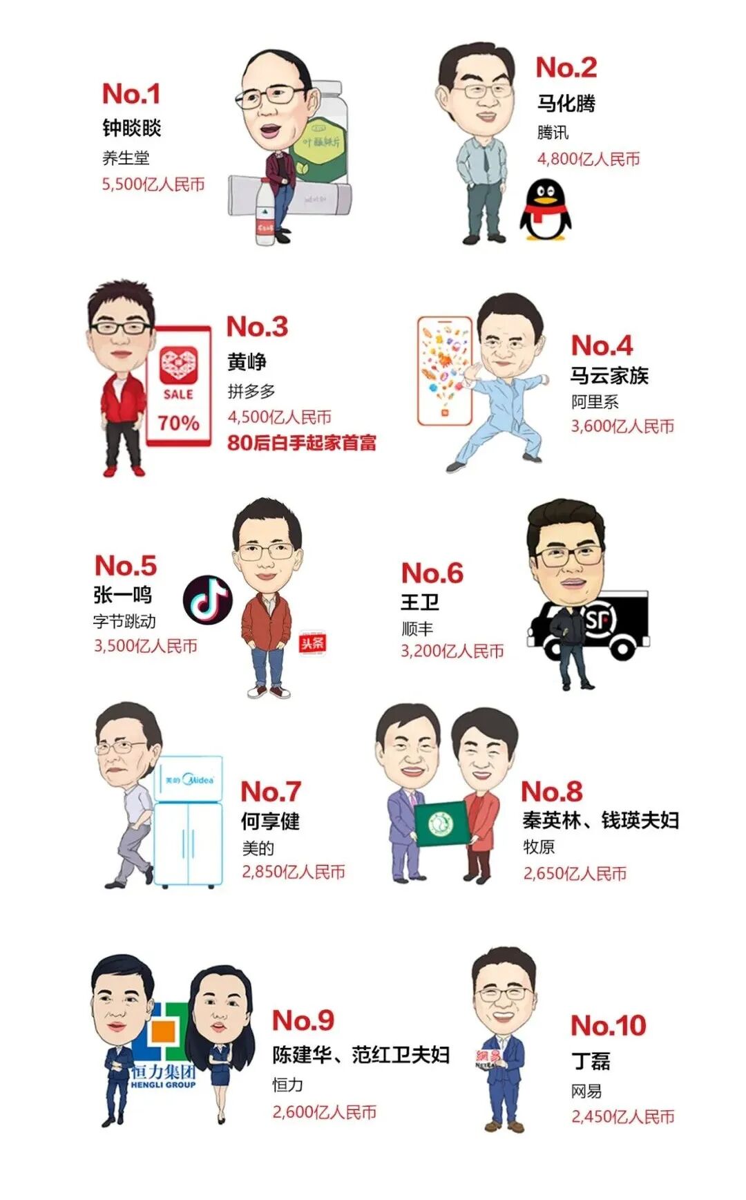 中国身家超10亿美元的企业家1058位,领先于美国的696位。“瓶装水之王”、农夫山泉67岁的钟睒睒以5500亿元人民币的财富成为第一位进入全球前十的中国企业家,位列第七,并成为亚洲首富。