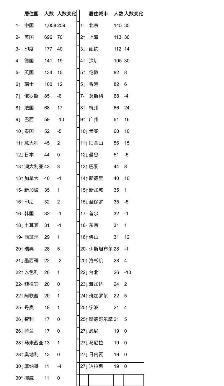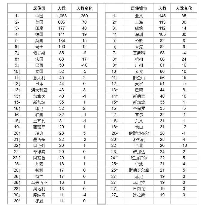 根据榜单数据,在过去的一年里,中国大大拉开与美国的差距,增加了259位居住在中国的十亿美金企业家,达到1058位,成为世界上第一个拥有1000位已知十亿美金企业家的国家。美国排名第二,有696位十亿美金企业家,比去年增加70位。