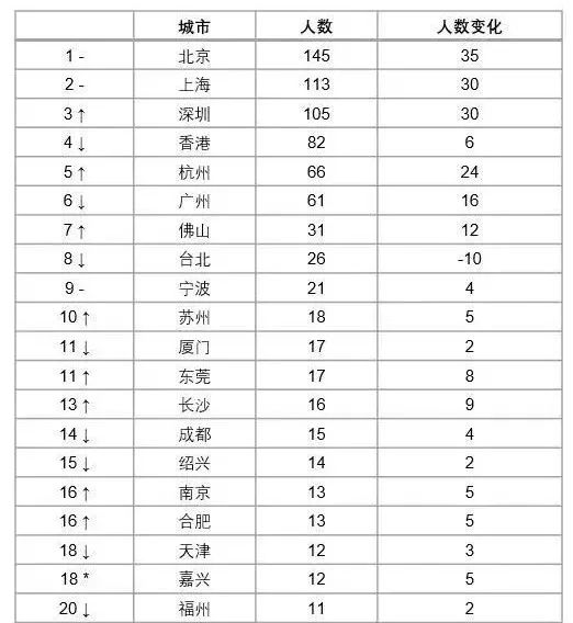 北京是世界十亿美金企业家之都,有145位十亿美金企业家居住在北京。上海超过纽约以113位排名第二。深圳增加了30位,超过了香港排名第三,广州以61位排名第九。富豪企业家人数最多的10个城市中,有6个在中国,分别是北京、上海、深圳、香港、杭州、广州。