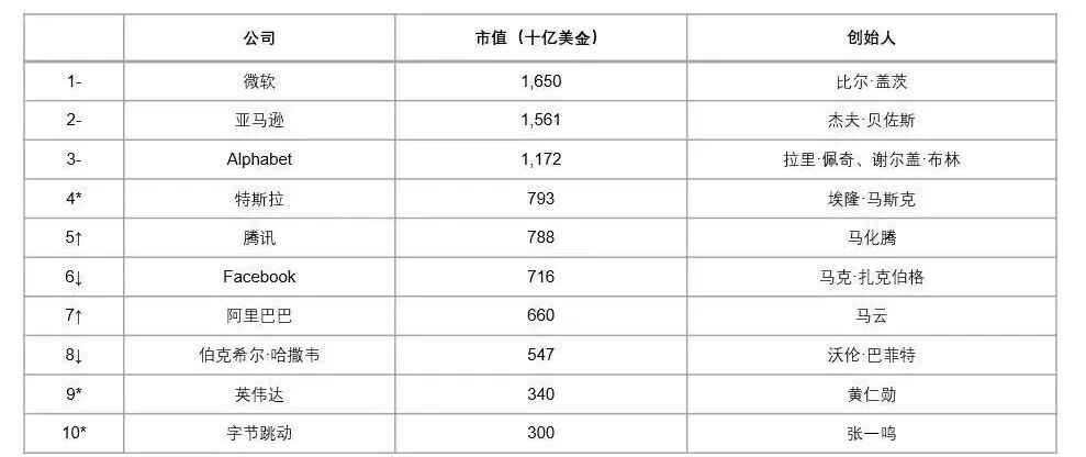 上榜企业家所创办的市值最大的公司:微软超越亚马逊,成为全球市值最大的公司。腾讯、阿里巴巴和字节跳动是进入前十的非美国公司。