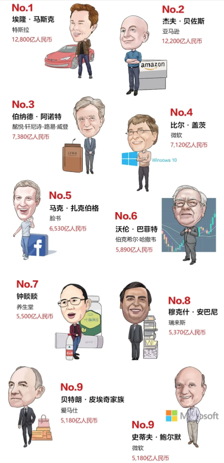49岁的埃隆·马斯克首次成为世界首富,财富比去年增加近万亿元人民币,相当于每两天增加近10亿美金,达到1.28万亿元人民币。他的大部分财富来自他21%的特斯拉股份,特斯拉目前市值接近8000亿美元。