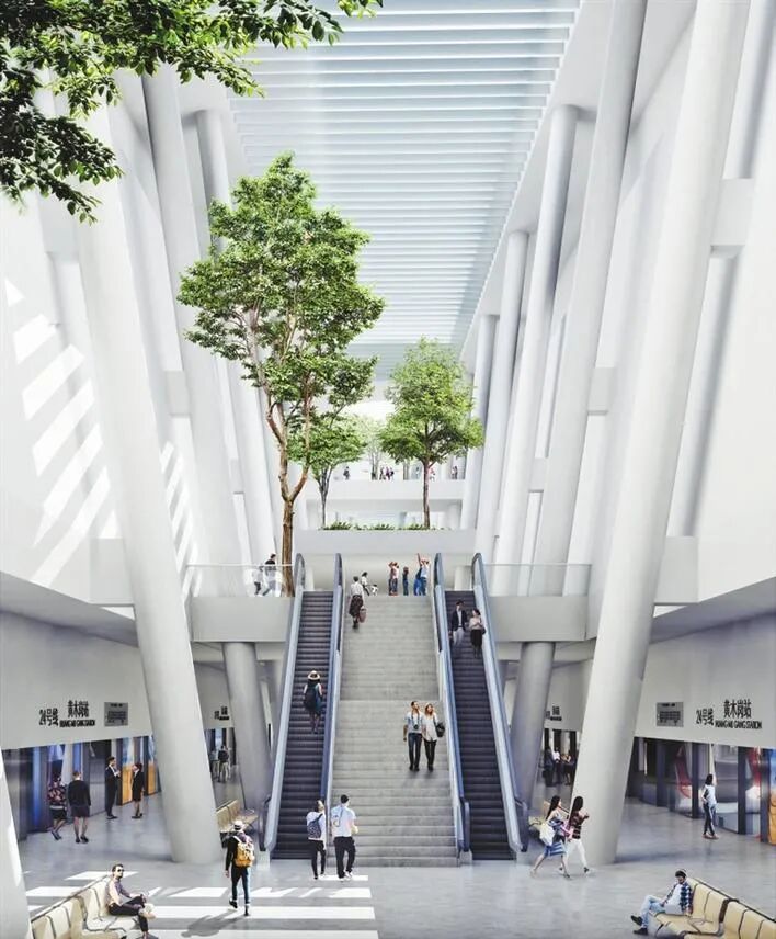 据介绍,黄木岗综合交通枢纽创新实现“引景入城”——采用带状天窗、下沉广场、生态廊道和立体绿化等,渗透地上地下空间边界,形成连续的景观空间,保存城市自然生态底蕴,延续城市生态脉络,实现“引光入城、引绿入城、引风入城”。
