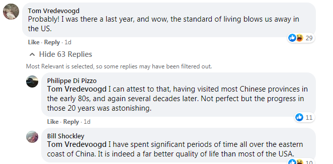 “我在中国东部生活了很长一段时间,那里的确比美国很多地方有更高的生活品质。”一位名为比尔的网友说。