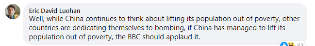 类似的争论在评论区还有很多,一位外国网友就此评论道:“当中国致力于脱贫攻坚时,另外一些国家却在轰炸别国,如果中国实现了脱贫攻坚目标,BBC应当为此喝彩。”