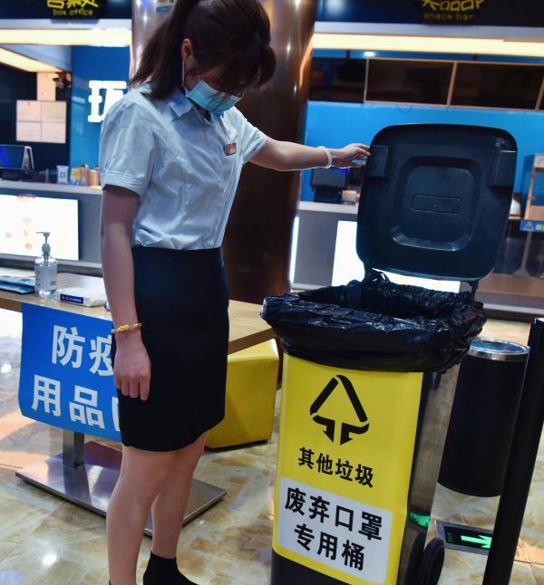 ↑资料图:江苏南通如皋市一家影院设置了废弃口罩专用回收桶(新华社)