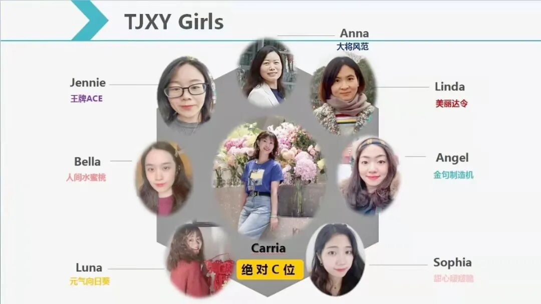 “风靡”荔外天骄的现象级女子组合!绝对C位Carria、王牌ACE Jennie、大将风范Anna、美丽达令Linda、人间水蜜桃Bella、元气向日葵Luna、金句制造机Angel、甜心啵啵脆Sophia,因学习而来,为未来而教!TJXY Girls!Go further!Go together!