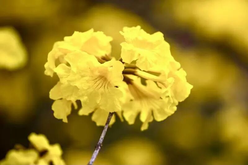 当你为这份美丽停留片刻,仔细看看就会发现,树上每朵花的花冠都呈漏斗形,状似风铃,花色纯黄,没有一点杂质。