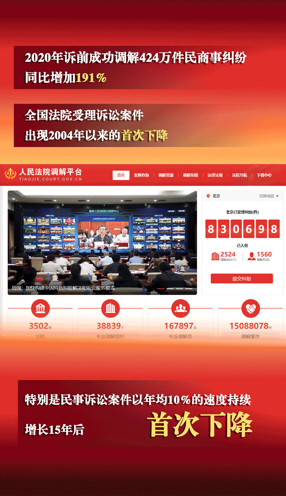 近年来重点建设的人民法院调解平台就是一站式建设的缩影。最高人民法院立案庭庭长钱晓晨介绍说,平台自2018年2月28日正式上线运行以来,已经完成与全国总工会、公安部、司法部、人民银行、银保监会、证监会、国家知识产权局等的“总对总”在线诉调对接,涵盖了劳动争议、道交事故、金融保险、证券期货、知识产权等纠纷领域,3.3万个调解组织、16.5万名调解员入驻平台,3502家法院全部实现与调解平台对接,为群众提供菜单式在线调解服务,累计调解案件超过1360万件,平均调解时长23.33天。特别是2020年,人民法院调解平台全面得到应用,每天有近1.7万件案件在诉前成功调解。