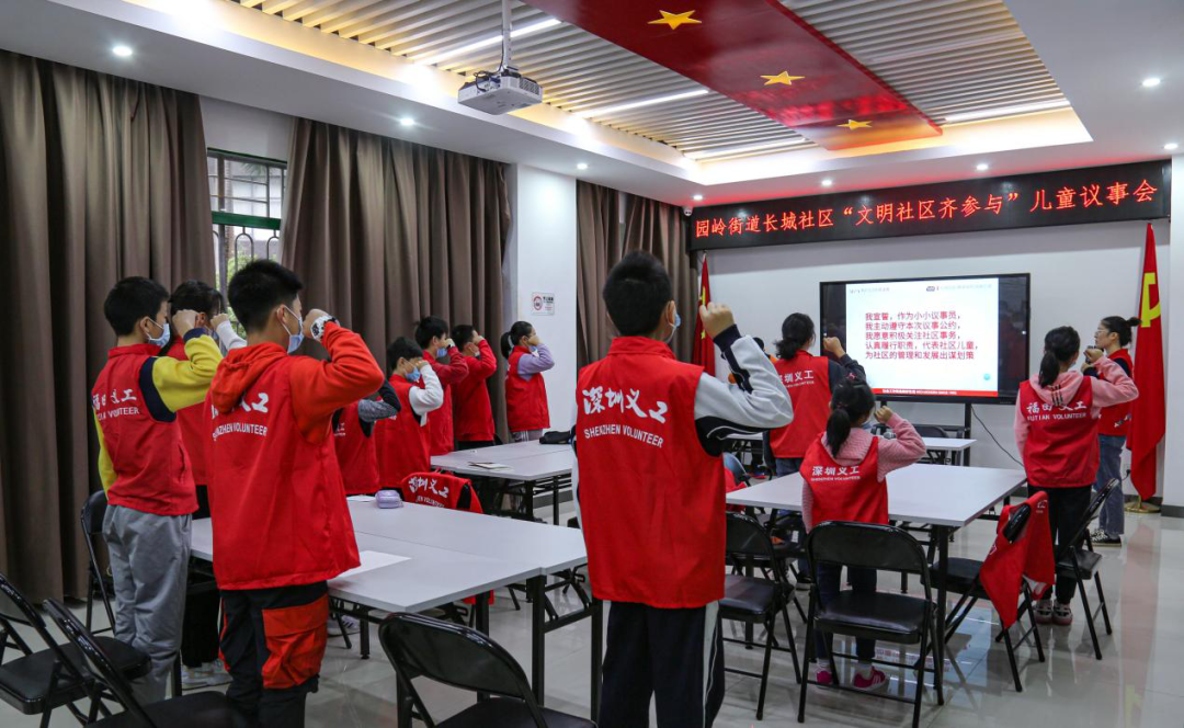 在福田区园岭街道长城社区党群服务中心里,一项特别的活动——“儿童议事会”正在火热开展,一群孩子身着红马甲,手握拳头跟着社区工作人员念“议事会”誓词。