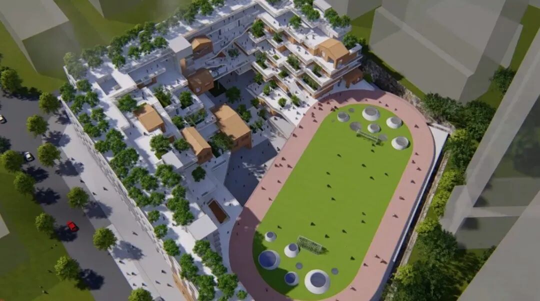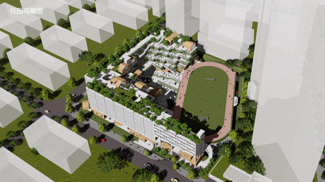 △ 校园俯瞰图,学校操场和周边住宅区的花园绿地相得益彰。