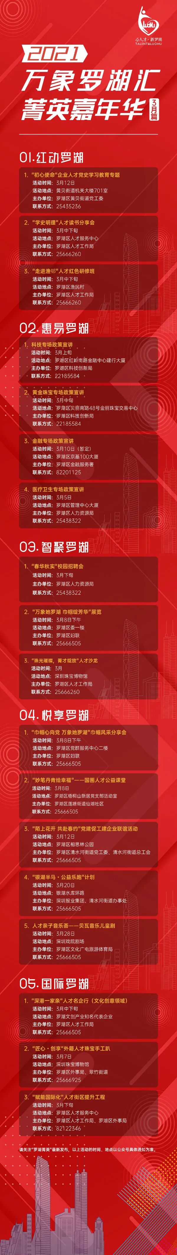 为团结引领、服务保障好各领域高层次人才,营造尊才爱才的人才发展环境,今年,罗湖区人才工作领导小组统筹全区服务资源,搭建联系沟通、关心关爱、凝心聚力的人才服务体系,以“红动罗湖”“惠易罗湖”“智聚罗湖”“悦享罗湖”“国际罗湖”五大主题开展人才交流、学习、服务活动,全面开启“万象罗湖汇 菁英嘉年华”系列活动,献礼建党100周年。