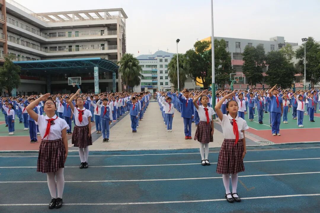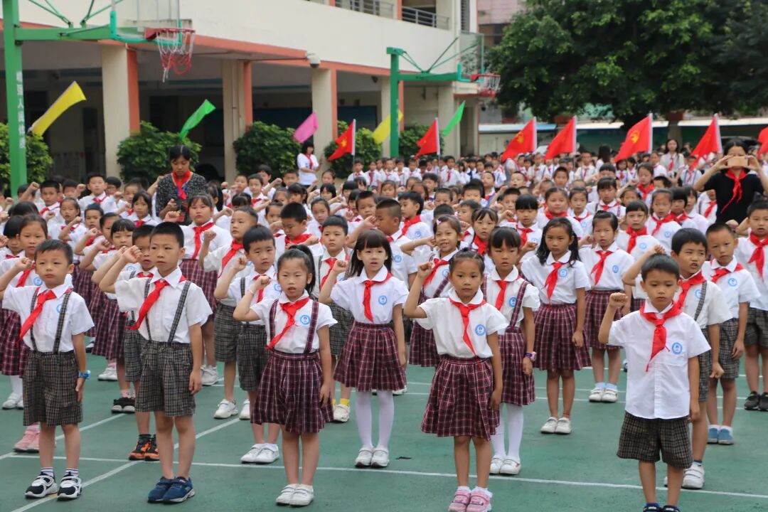 德龙学校的少先队员胸前的红领巾随风飘扬