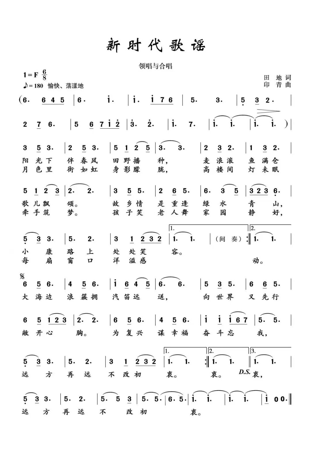 《新时代歌谣》的歌词是清新宜人的,音乐是动感欢快的,但在主题的传达上却毫不含糊,始终站在历史的山顶上来观照时代的洪流。尤其在副歌部分,“为复兴谋幸福奋斗忘我,远方再远,不改初衷”,鲜明而富有力量地点出了这首作品的主题,寓意深远。作曲家以干脆利落的强收结尾,留下袅袅余音和无穷回味。