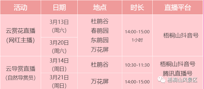 活动内容:自然教育活动采用线上+线下双模式,其中线上有云赏花和云导赏由网红主播和专业人员导赏直播梧桐山花海景观,线下由梧桐山优秀自然导赏员为市民提供自然导赏,通过直播方式带领大家领略景区自然风光、认识沿途植物等内容。