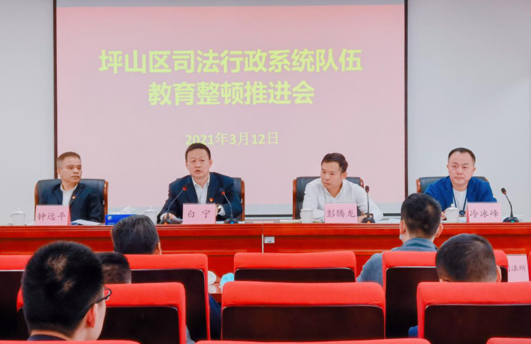 3月12日,坪山区司法局召开全区司法行政系统队伍教育整顿工作推进会议,深入学习贯彻全国政法队伍教育整顿动员部署会议和全省、全市政法队伍教育整顿领导小组会议、工作推进会议、全区政法队伍教育整顿领导小组会议、工作推进会及全国、全省、全市司法行政系统队伍教育整顿会议精神,对全区司法行政系统队伍教育整顿工作进行再动员、再部署、再落实。