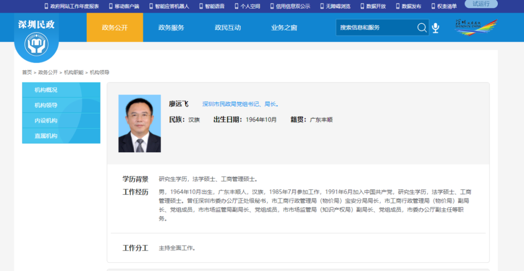 小政获悉,廖远飞先后担任市市场监管局党组成员、副局长,市委办公厅副主任,市民政局党组书记、局长。在市民政局的官方网站上,依然能找到廖远飞的相关资料。