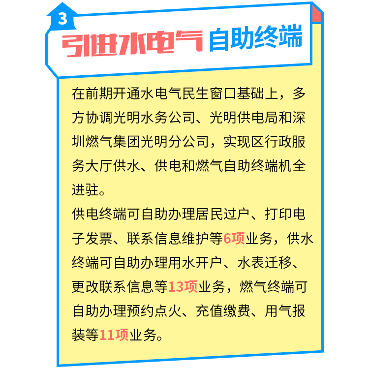 水电气三位一体,是市民生活的大问题。光明政务在全面优化营商环境上持续发力,不断拓宽服务领域,创新服务模式。近日光明区行政服务大又推新品,光明政务水电气全面升级服务大礼包,30项业务可一站式自助办理。