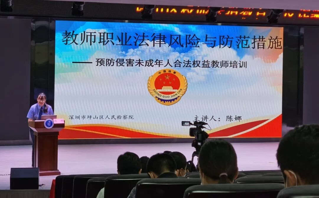 在宣讲活动中,坪山区人民检察院检察官陈娜进行了题为《教师职业法律风险与防范措施》的授课,陈娜以严谨的法律条文和生动的事实案例,警示学校教职员工遵纪守法,对学校预防侵害未成年人合法权益提出了防范建议。