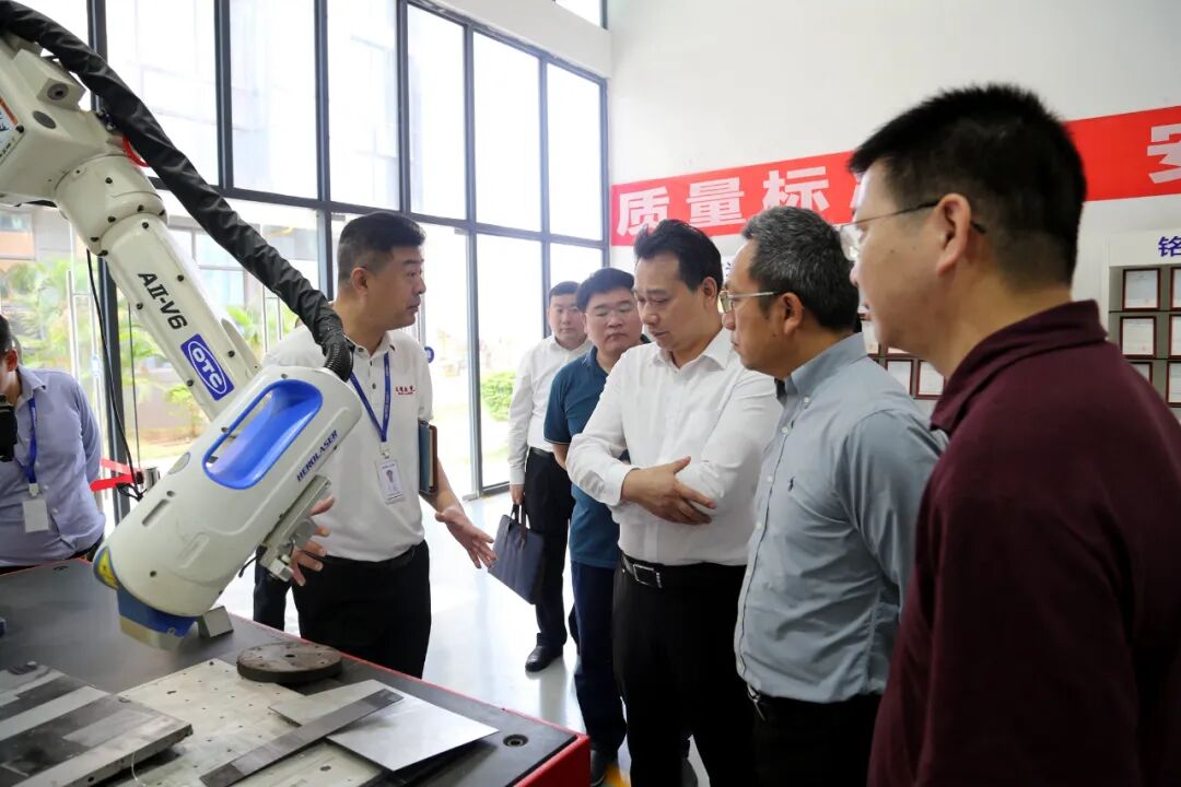 ▲在深圳对口帮扶河源指挥部副总指挥、广东省深河产业投资开发有限公司董事长成嶂旻,盐田区对口帮扶东源县工作组组长王卓勇等陪同下,调研组在铭镭激光智能设备(东源)有限公司考察。