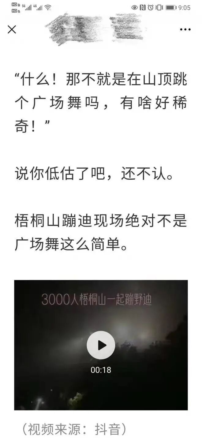 该推文还配发了一段题为《3000人梧桐山一起蹦野迪》的抖音视频,显示在夜幕下的某个场所,有人打开手电等照明工具狂欢的场景,在震耳欲聋的音乐声中,还有疑似现场DJ的配音。(该推文已被删除)