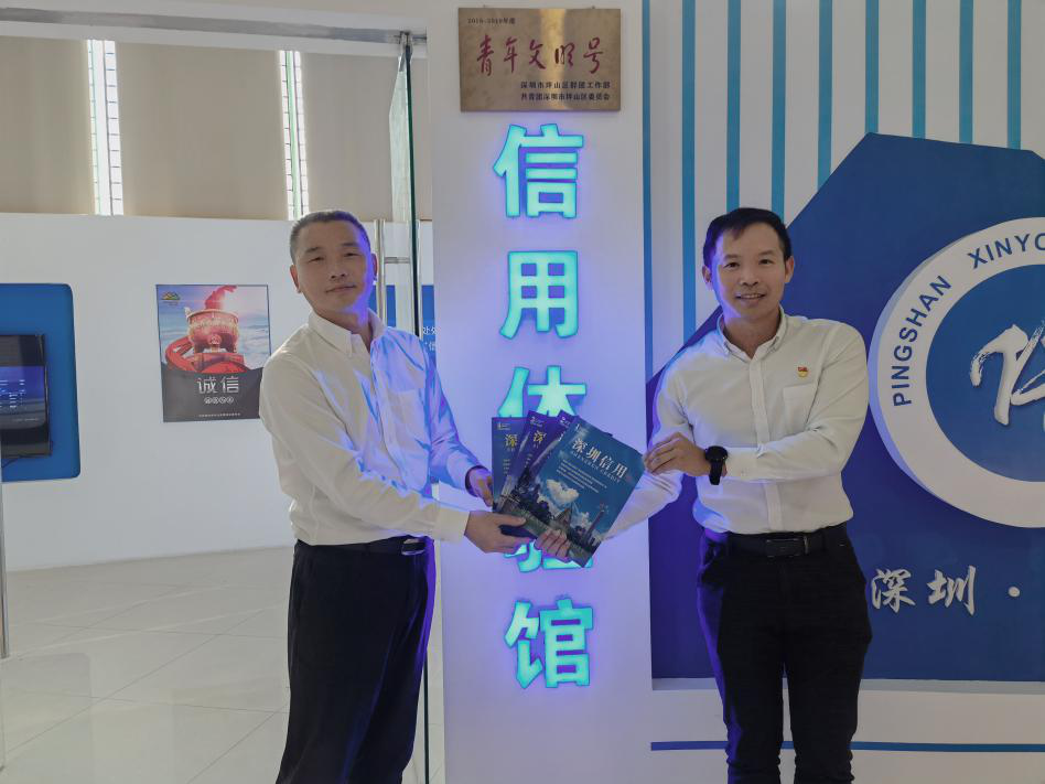 最后调研组前往全国首家公共信用体验馆进行参观,详细了解了坪山信用体系建设、坪山公共信用信息应用新机制、信用知识学习、文明诚信积分、企业社会责任、企业信用承诺等13个展区和信用大数据展示、信用报告打印、诚信消费体验、信用借书体验四大互动式信用体验区,并在馆内举办了《深圳信用》读本的赠阅仪式。