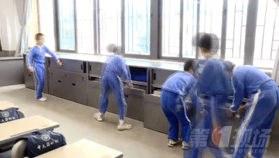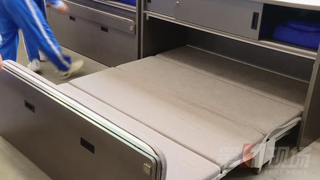 学生们午睡的秘密,就藏在这一排排储物柜里。值日的十多位同学,三个人一组配合默契,先把课桌椅挪动到教室中心,再把隐藏在储物柜里的床拉出来,从抽屉里取出小被子、枕头和眼罩,不到五分钟,教室就变成了静悄悄的午休室!