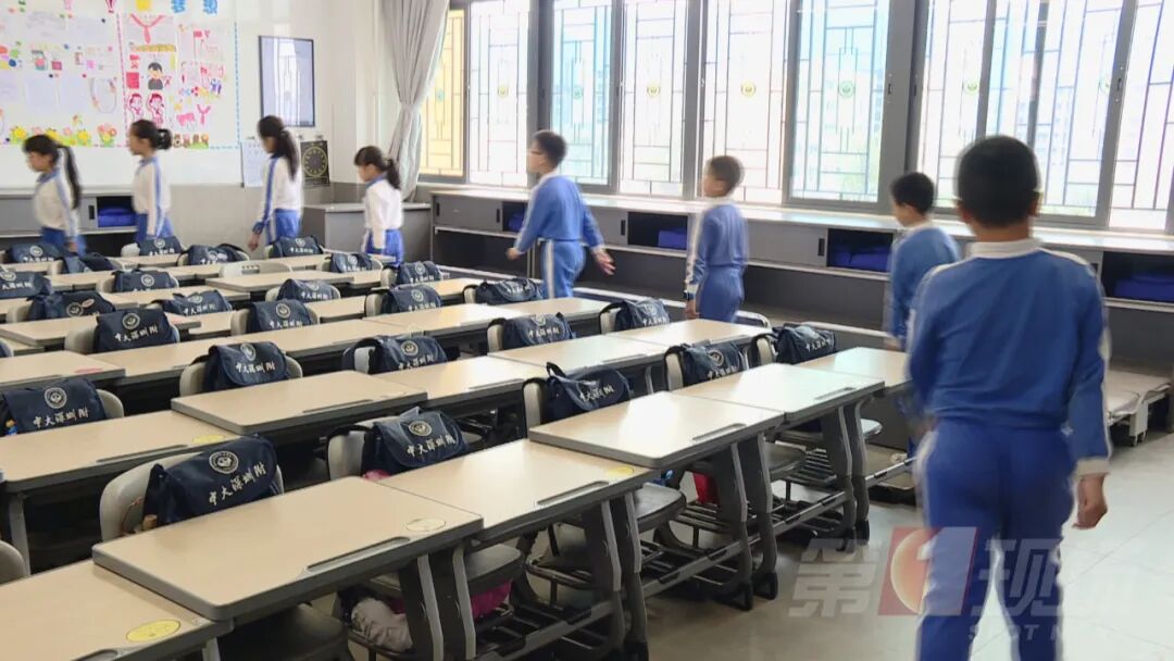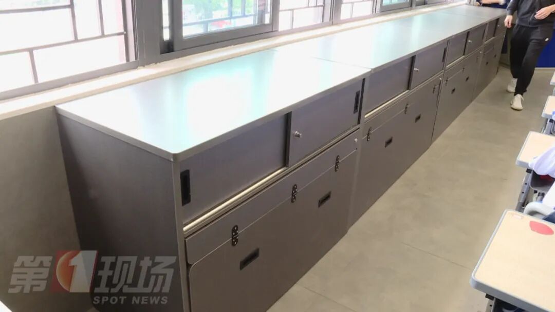 记者来到位于光明的中山大学深圳附属学校,看到这里每个教室,除了讲台这面,其他三面靠墙边都放置了长排储物柜。