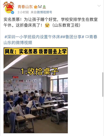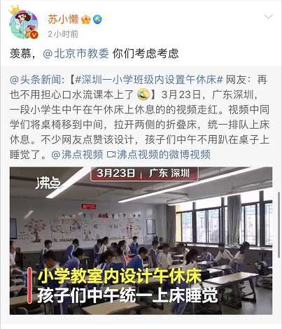 据了解,中山大学深圳附属学校,是九年一贯制公办学校,去年9月招生,目前有1-7年级共45个班,每个班都配有午休床。有家长忍不住把孩子在学校有午睡床的事,在朋友圈分享,引来其他学校家长“羡慕嫉妒”。