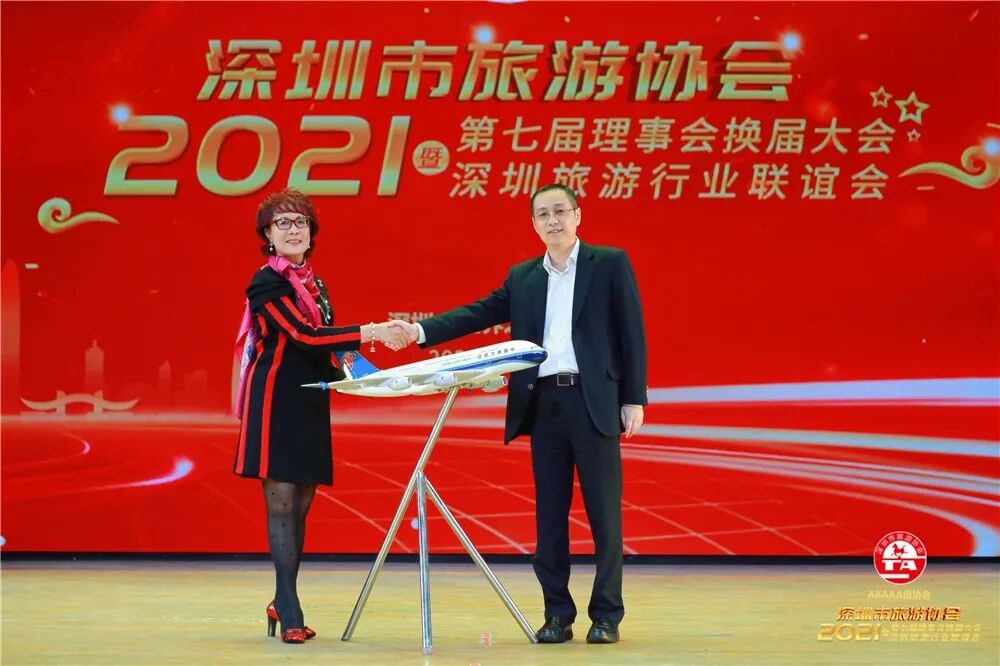 大会上,协会新当选副会长单位中国南方航空股份有限公司深圳分公司还向深圳市旅游协会赠送了超大型的南航飞机模型,深圳市旅游协会副会长、深圳市酒店业商会荣誉主席(创会会长)郑玮玲上台接受纪念品。