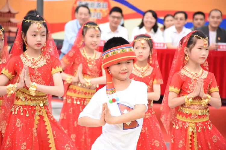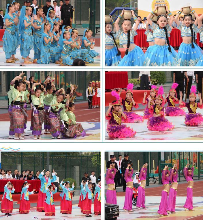 小学部学生们的国旗巡展精彩纷呈,穿着红色古装的“中国人”,穿着白色长袍的“阿拉伯人”,穿着浅绿色东南亚风格服装的“缅甸人”……或载歌载舞、或表演地域风情,展现了亚洲多彩的文化氛围。值得一提的是,学生们展示了习近平总书记《在“亚洲文明对话大会”上的致辞》的绝妙翻译秀,“小翻译家们”发音准确、翻译精妙,现场掌声不断。