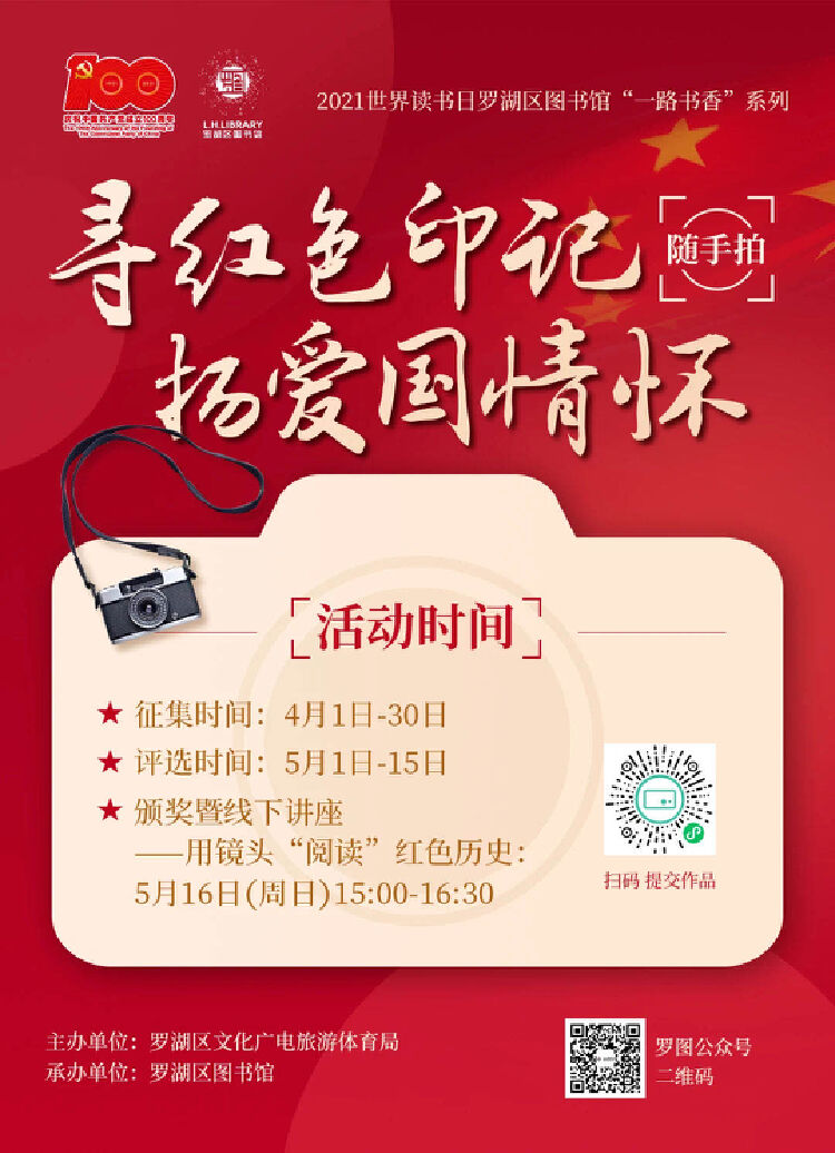 从4月1日起,罗湖区图书馆开展为期一月的“寻红色印记,扬爱国情怀”随手拍线上征集活动,正式启动本届世界读书日特别系列活动。本次活动倡议市民读者走进身边的红色景点,追随红色轨迹,以“随手拍”的形式传承红色基因。书香党旗共飘扬,读者除了可以用镜头传播红色文化外,还可以参与“百年荣光 薪火相传”线上知识有奖竞答,重温党的百年历程大事件,以优异的答题成绩迎接建党100周年。