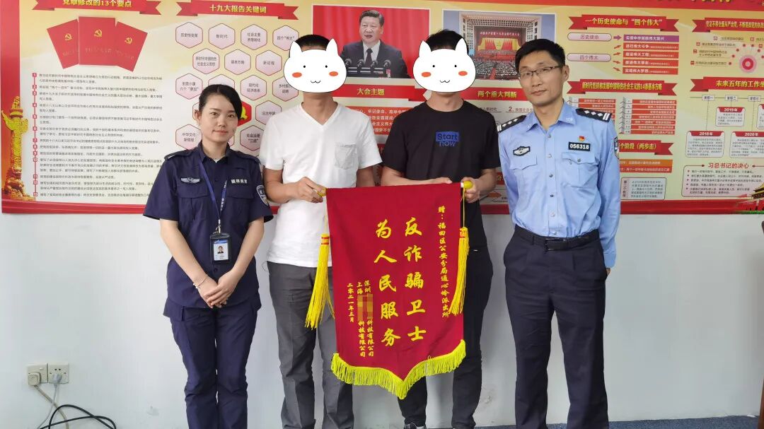 3月29日下午,深圳市公安局福田分局通心岭派出所收到了一面锦旗,上书:“反诈骗卫士 为人民服务”。送来锦旗的是来自深圳、上海的两家公司代表,他们向派出所民警、反诈专员表示感激:“为我们两家公司都避免了财产损失,真是太感谢了,多亏了你们不厌其烦经常上门做反诈宣传!”