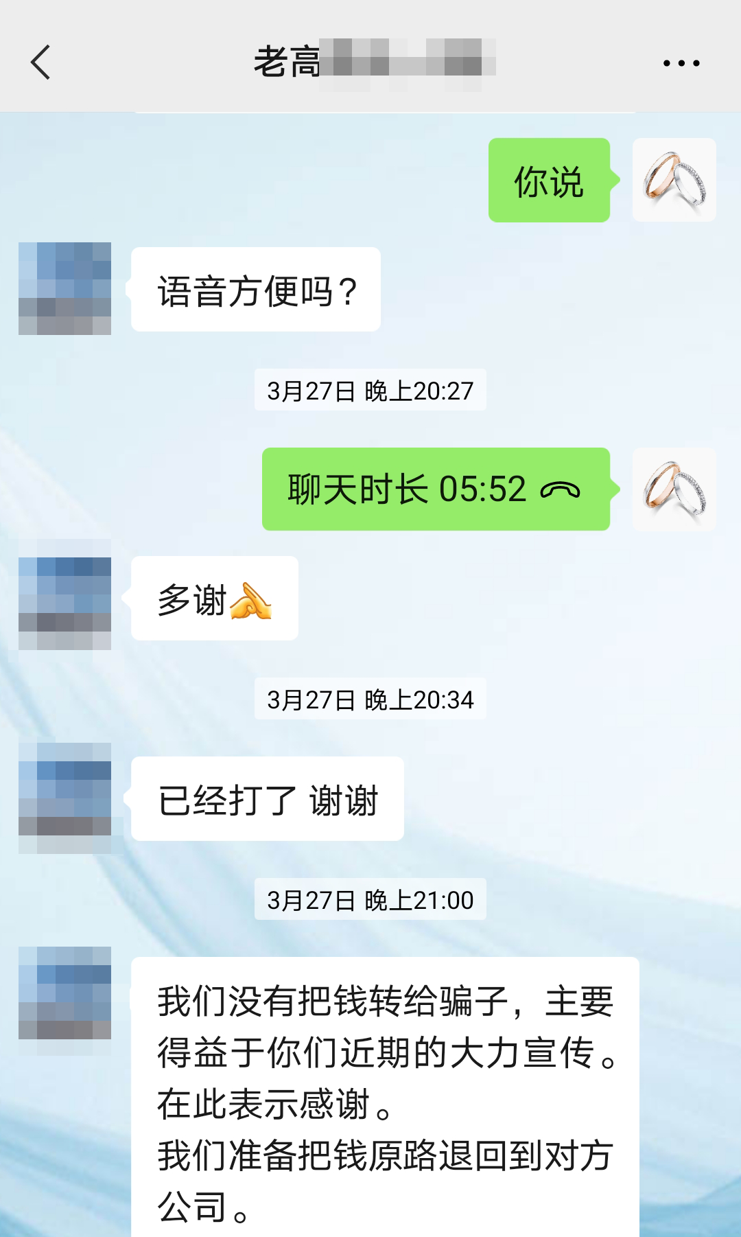 “我们没有把钱转给骗子,主要得益于你们近期的大力宣传,在此表示感谢。我们准备把钱原路退回到对方公司。”B公司工作人员高先生在微信中向邓佳表示。