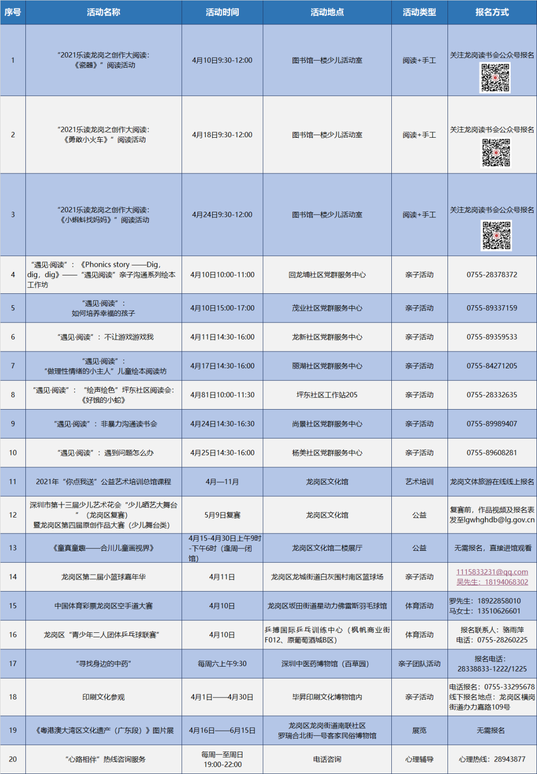 好消息!4月龙岗区关爱未成年人公益文化活动来了!亲子共读、公益艺术培训、篮球、乒乓球、羽毛球、快乐成长营、DIY活动……200多项形式各异的活动适合不同喜好、不同文化背景的未成年人。