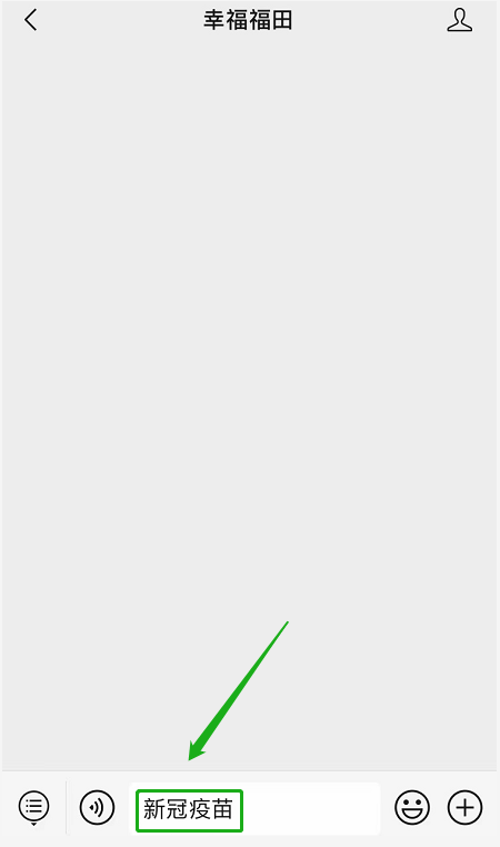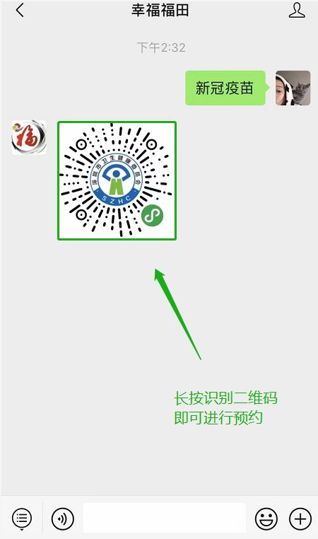 ① 在【幸福福田】公众号中,对话框发送关键字【新冠疫苗】,识别弹出的【二维码】。