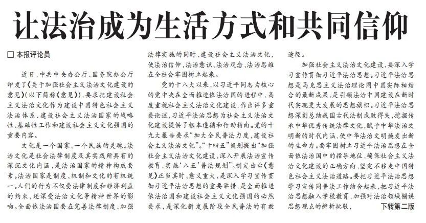 近日,中共中央办公厅、国务院办公厅印发了《关于加强社会主义法治文化建设的意见》(以下简称《意见》),要求把建设社会主义法治文化作为建设中国特色社会主义法治体系、建设社会主义法治国家的战略性、基础性工作和建设社会主义文化强国的重要内容。