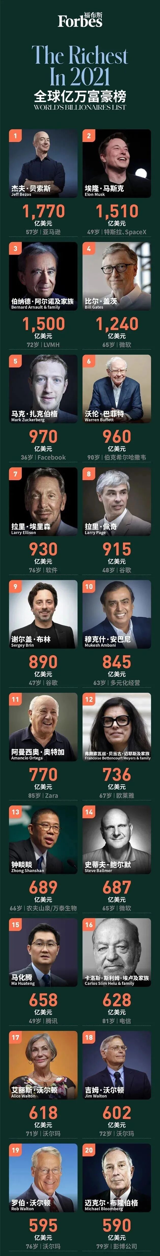 全球TOP20位顶级富豪中,亚马逊创始人杰夫·贝索斯连续第四年蝉联富豪榜榜首,拥有1770亿美元财富;埃隆·马斯克从去年的第31位飙升至第2位,财富为1510亿美元;法国LVMH的伯纳德·阿尔诺仍排在第3位,为1500亿美元,紧随其后的是排名第4的微软比尔•盖茨;脸书的马克·扎克伯格在榜单排名第五。全球最有钱的两个人,一个是互联网巨头,一个是创新不止步的天才。