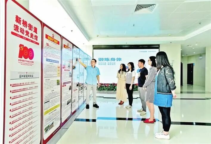 新桥街道“流动党史馆”,通过珍贵的历史图片、详实的文字说明,向观众展示百年来中国共产党带领全国人员艰苦奋斗、为中华民族伟大复兴拼搏进取的光辉历程。展板上一幅幅弥足珍贵的照片,记载了革命前辈的奋斗历程和丰功伟绩。党员们在展板前一起交流,一起学习,在细细品味中,领略党的百年风华。