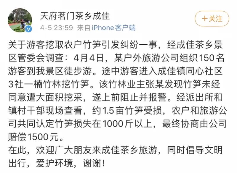 记者注意到,蒲江县成佳镇人民政府官方微博于4月5日晚对此事发文回应称,关于游客挖取农户竹笋引发纠纷一事,经成佳茶乡景区管委会调查,4月4日,某户外旅游公司组织150名游客到该景区徒步游。途中游客进入成佳镇同心社区3社一楠竹林挖竹笋。该竹林业主张某发现竹笋未经同意遭大面积挖采,遂上前阻止并报警。经派出所和镇村干部现场查看,约1.5亩竹笋受损,农户和旅游公司共同认定竹笋损失在1000斤以上,最终协商由公司赔偿1500元。
