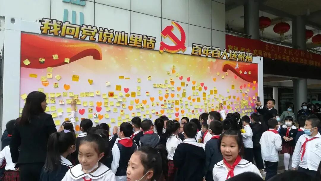 福强小学学生把最想向党说的话写在便签纸上,制作成一张心意卡,把心意卡张贴到校门前的主题展板上。热烈的气氛感染了不少学生家长及周边社区居民,活动整整持续了一周,反响热烈。
