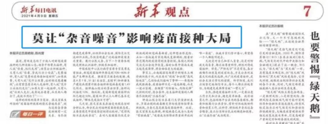 ▲4月9日,新华社发表题为《莫让“杂音噪音”影响疫苗接种大局》的评论文章