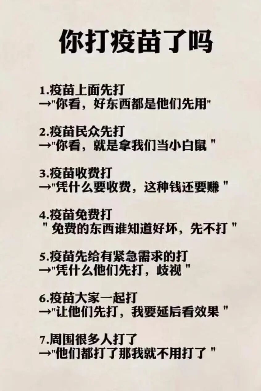 领导干部带头接种,有人说“你看,他们先用”;动员公众积极接种,又有人说“你看,拿我们当小白鼠”;免费接种,有人说“免费的东西谁知道好坏”;如果收费,又有人说“凭什么收费,这时候还想着赚钱”;让有紧急需求的人先接种,有人说“凭什么让他们先打”;如果大家一起接种,又有人说“让别人先打,我要延后看看,而且别人都打了,我就不用打了”……