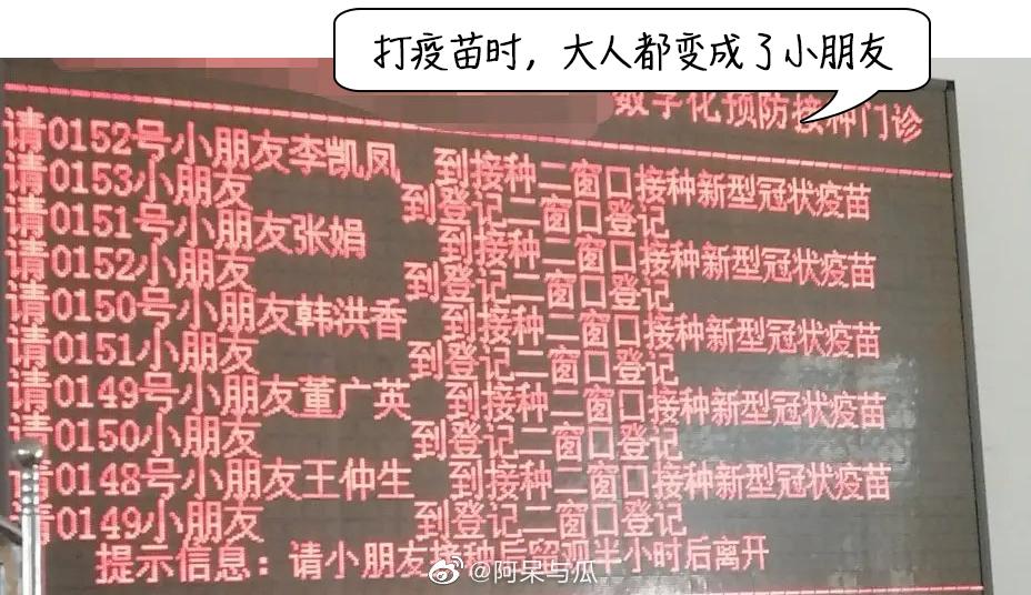 因临时使用儿童打疫苗系统,成年人打新冠疫苗时都变成了小朋友。来源:微博