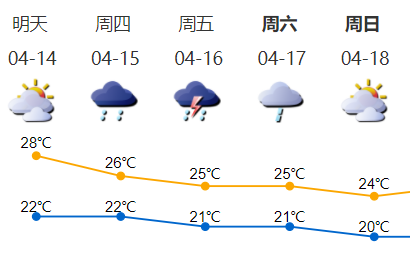 14-15日偶有分散阵雨,沿海高地和海区最大阵风6-7级;
