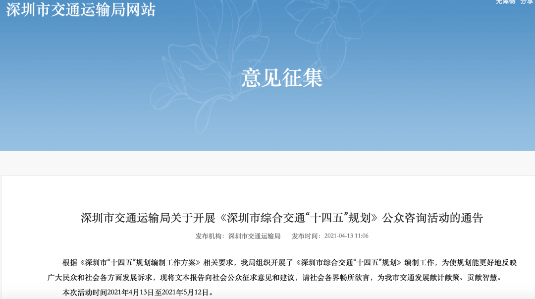 4月13日,深圳市交通运输局官网发布了《深圳市综合交通“十四五”规划》(以下简称“规划”)公众咨询活动的通告,公布未来五年深圳综合交通发展总体部署和统筹安排。